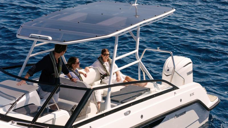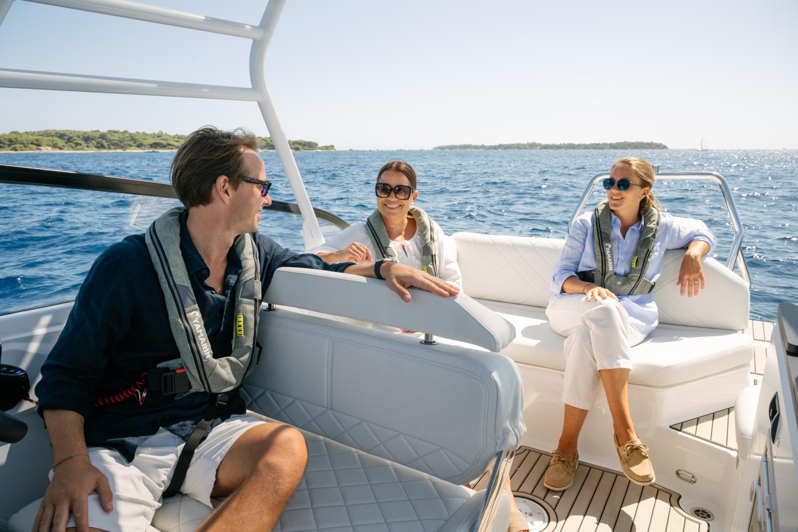 Standard equipment includes an electrical WC, refrigerator, 16" Yamarin Q smart display, Navionics charts and Softdeck coatings in the open space. Optional equipment includes a second 16" display, heating or air conditioning, a bimini top or canopy, a table in the open space, a sunbed and a bimini top for the bow deck.