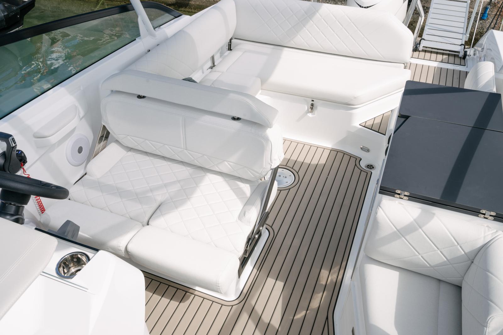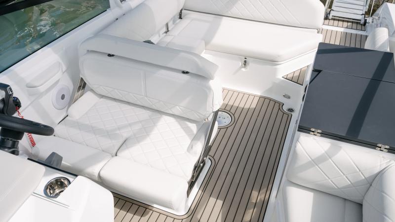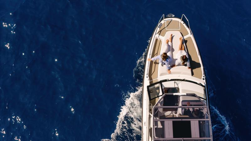 In addition to easy access from the bow, the boat also provides unobstructed and flat passage from the stern. The swimming platforms are covered in Softdeck non-slip floor surfaces that are very durable and comfortable even for bare feet, and they extend far along the sides of the boat. In front of the outboard, there is a spacious storage space into which the boat's canopy can be easily folded.